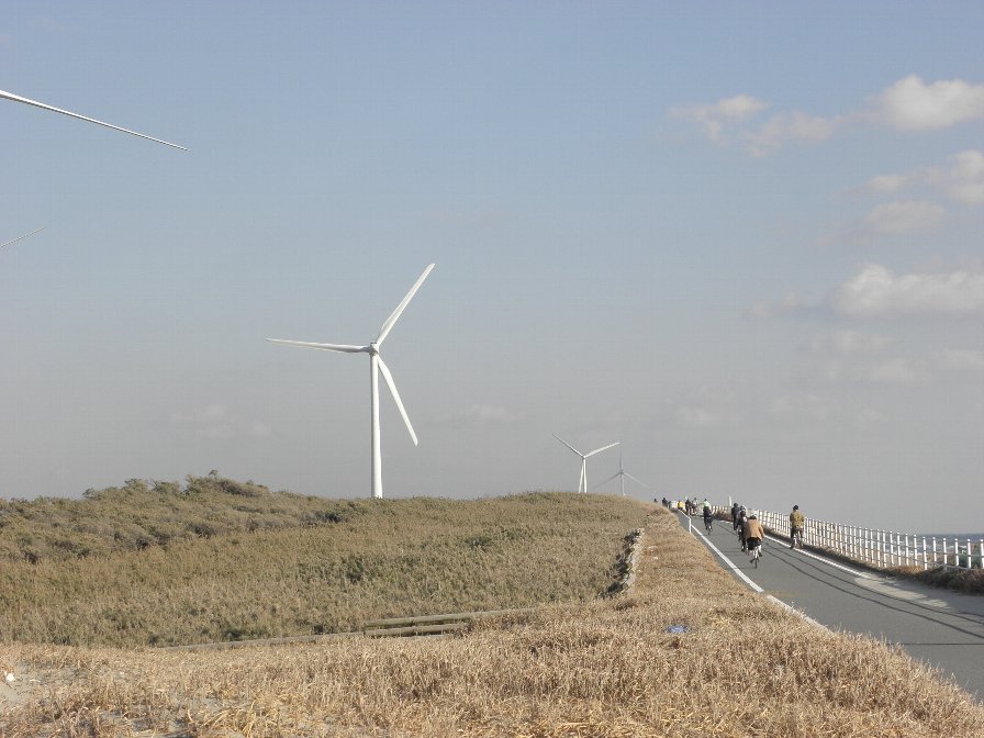 風力発電設備が並ぶ、海辺のサイクリングロード